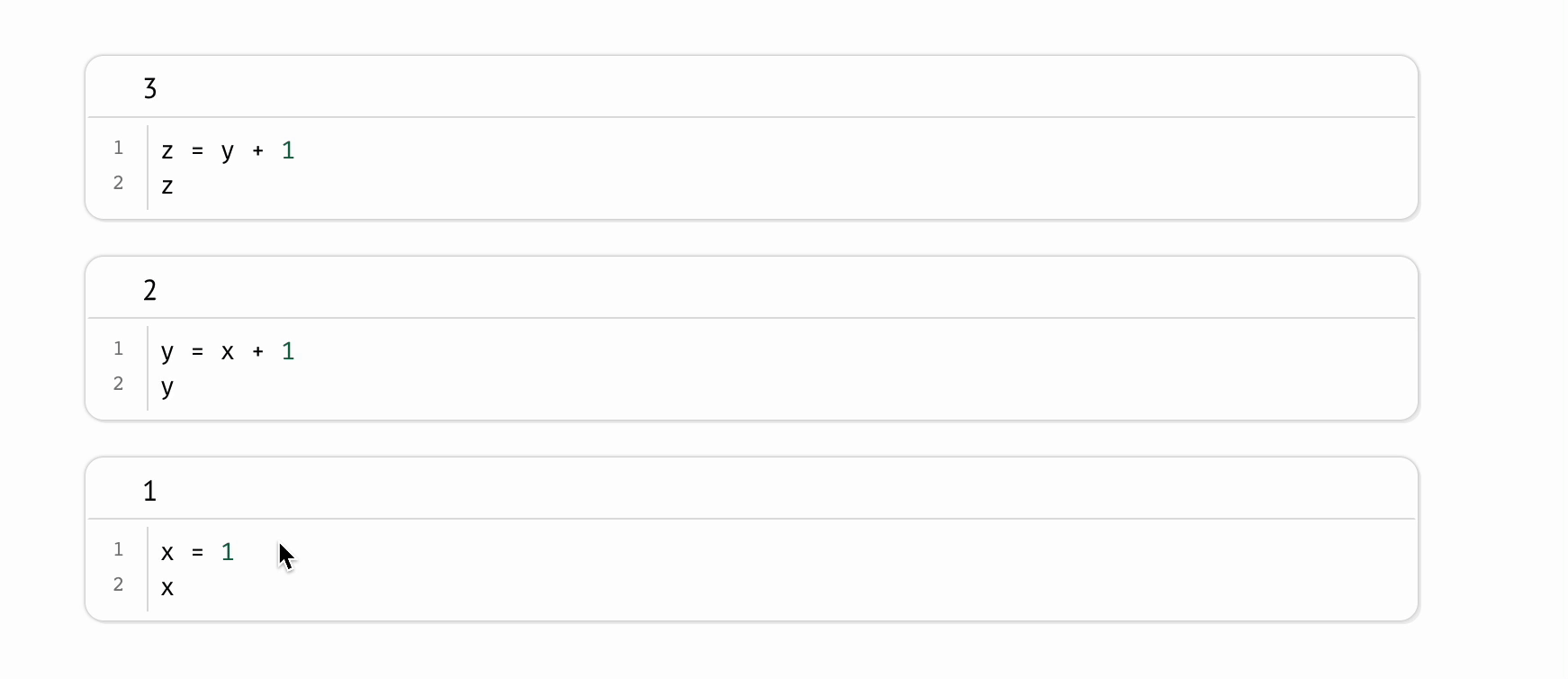 Execution order. The order of cells on the page has no bearing on the order cells are executed in: execution order is completely determined by the variables cells define and the cells they read. You have full freedom over how to organize your code and tell your stories: move helper functions and other “appendices” to the bottom of your notebook, or put cells with important outputs at the top.